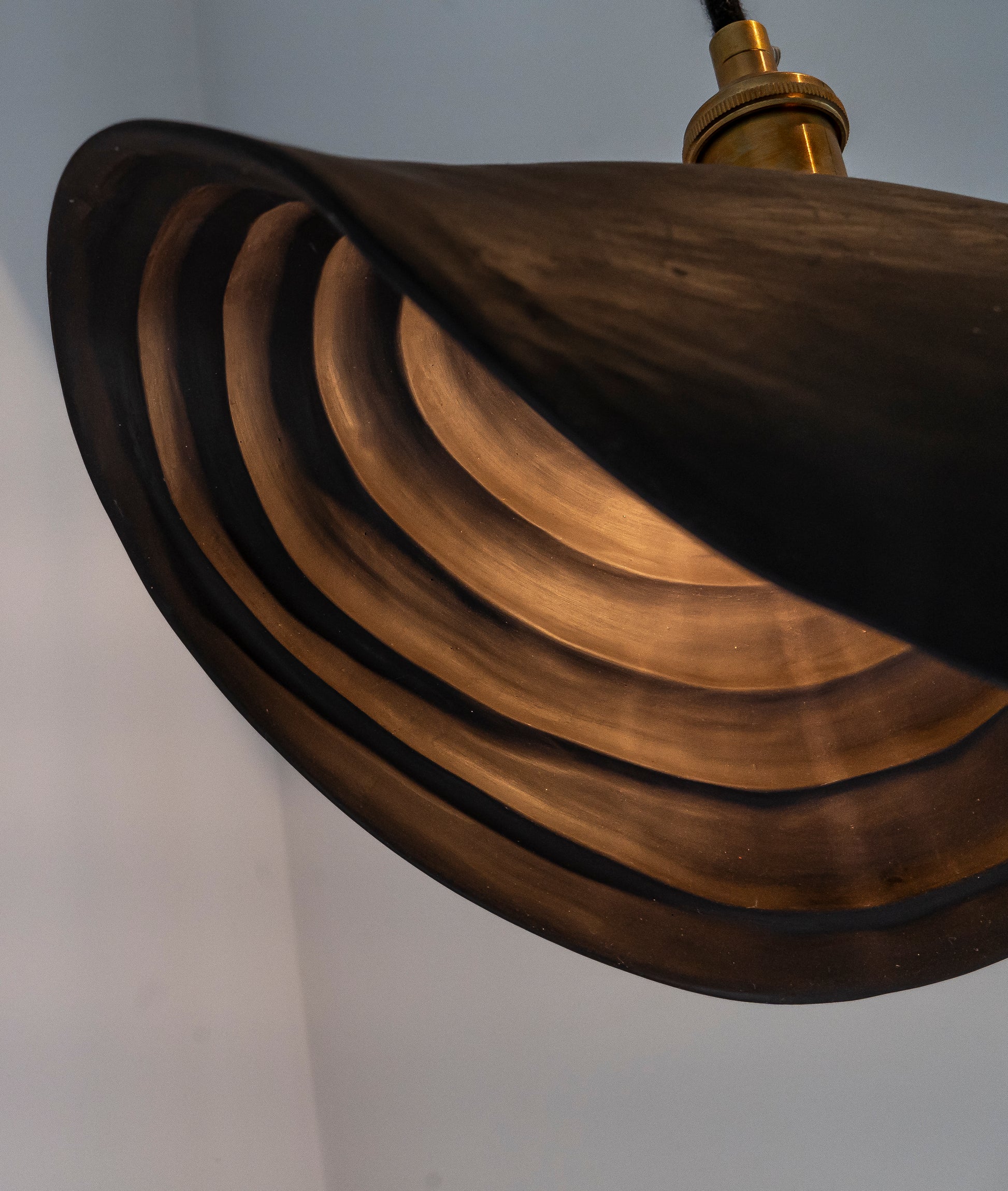 Introducing the Brava Sombra series black clay pendant light, an elegant addition to any modern or minimalist interior. Each piece is handcrafted with meticulous attention to detail, showcasing the sleek beauty of black clay. The pendant features a smooth, matte exterior that beautifully contrasts with the crisp, curving patterns cast in sharp relief on the interior.